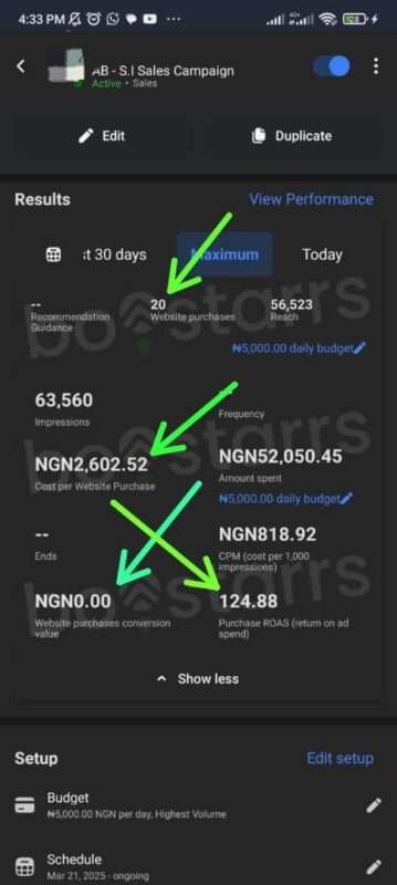 These are other campaign variations with different targeting for the product of ₦17500; it cost us ₦5,500 to get one. I optimized the campaign from ₦501 cost per result to ₦431 cost per result at this point we’ve spent ₦70,379 on ads but the campaign ended at one of the campaigns you saw above which had ₦187,084 spent on ads, the optimized campaign ended up generating 429 orders with a cost per result of ₦500 and a daily budget of ₦5000. 233 orders out of those 429 were successfully delivered and paid for, which is about a 54% conversion rate. After factoring in the product cost, ad expenses, and delivery fees(Avg. of ₦5000), our profit per product sold was about ₦6500, resulting in a total profit of over ₦1,514,500 from this ad campaign.